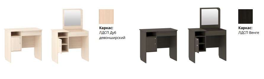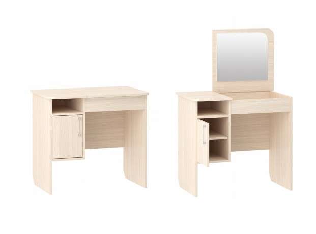 Универсальный дизайн и популярные цвета декоров. Зеркало, интегрированное в рабочую поверхность стола. Ящик и полка для хранения.