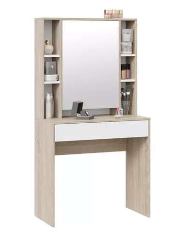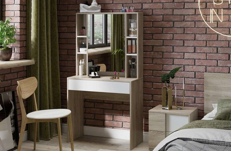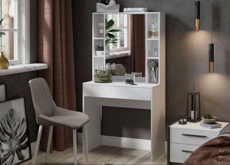 Помимо внешней привлекательности стол имеет большое зеркало, за которым размещены скрытые полки для хранения всех необходимых аксессуаров и косметики. Наличие открытых полок позволит установить предметы декора, а практичный выдвижной ящик добавит места для необходимых мелочей. В этом туалетном столике нет ничего лишнего, только самое необходимое для уголка женской красоты.
