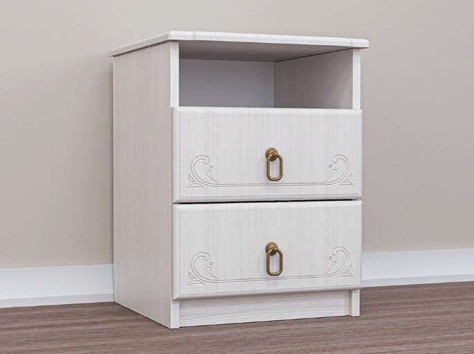 Тумба имеет два вместительных ящика, открытую нишу и достаточно широкую верхнюю поверхность, что позволит расположить на ней будильник, телефон, стакан воды, любимую книгу.