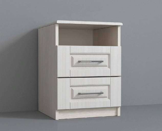 Тумба имеет два вместительных ящика, открытую нишу и достаточно широкую верхнюю поверхность, что позволит расположить на расстоянии вытянутой руки будильник, телефон, стакан воды.