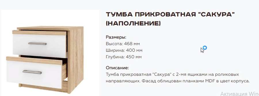 Тумба прикроватная с выдвижным ящиком на роликовых направляющих из спального гарнитура «САКУРА».