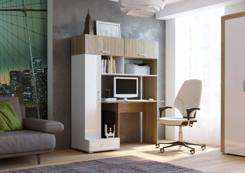 Очень симпатичный функциональный стол.Фасады, выполненные в цвете «Белый глянец» комбинируются с фасадом и корпусом «Дуб сонома». Рабочая зона стола (под монитор и клавиатуру), ШхГ: 1200х570 мм, высота под монитор 430 мм.
