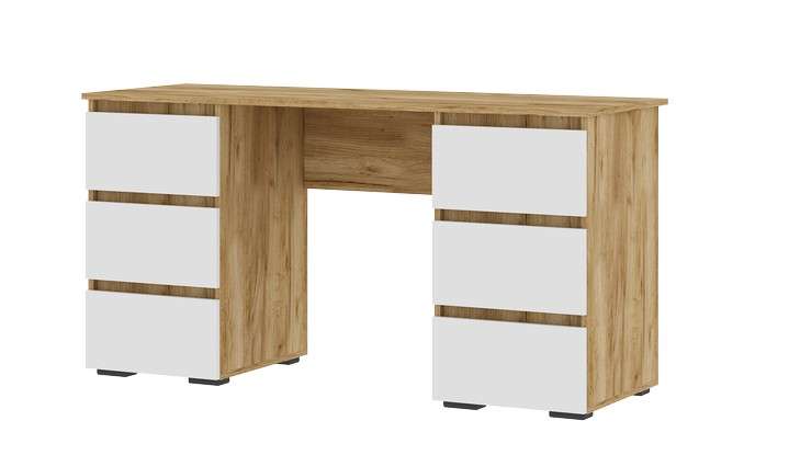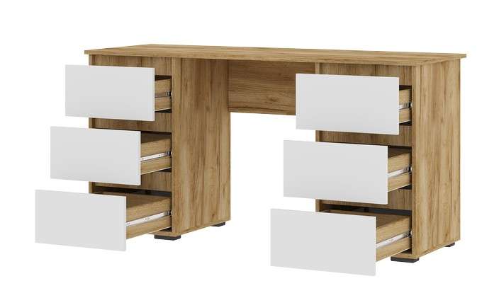 Письменный стол совмещает в себе рабочую поверхность с двумя тумбами, оснащенными тремя ящиками. Такой вариант подойдет как в детскую комнату , так и в рабочий кабинет.