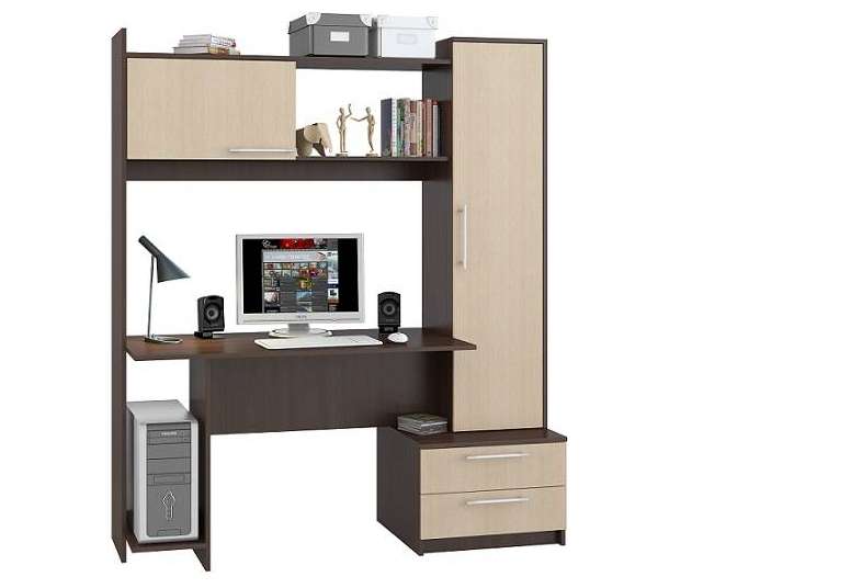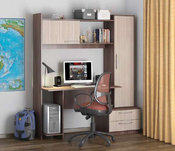 Широкая столешница поможет с комфортом расположиться за работой с компьютером или ноутбуком, а множество различных секций для канцелярии, книг и прочей сопутствующей атрибутики сделают рабочее пространство аккуратным и организованным. В боковом стеллаже на нижней полке можно удобно разместить системный блок. За распашными дверками также находятся полки.