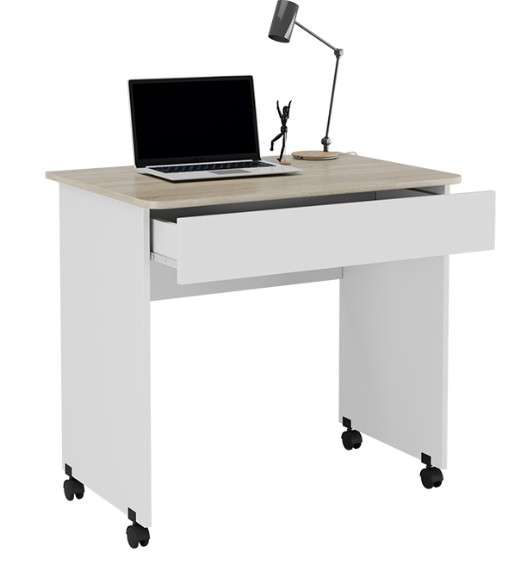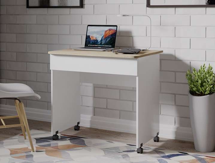 Небольшой и лаконичный стол в современной расцветке, с ящиком для размещения книг, тетрадок и других необходимых вещей.