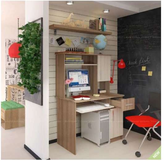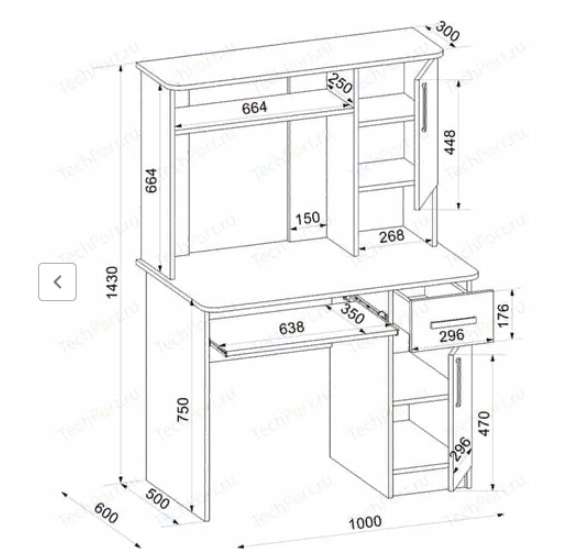 Стол оснащен выдвижной полкой под мышь и клавиатуру, имеет верхнюю надстройку с нишей под монитор. Справа под столешницей - тумба с выдвижным ящиком и полками за распашной дверкой.