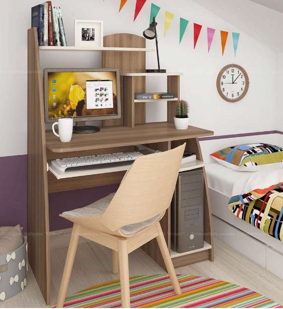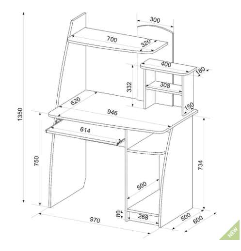 Имеет фигурную столешницу, над столешницей - надстройка с полками под книги, диски и канцелярские принадлежности, образующими нишу под монитор. Справа под столешницей расположена тумба с полкой и нишей под системный блок.