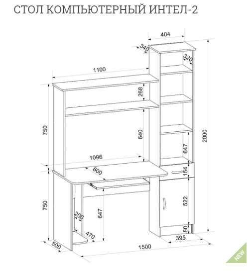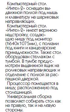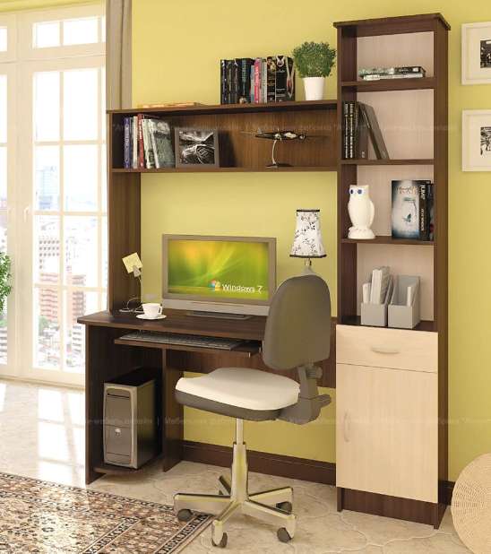 Оснащен выдвижной полкой под мышь и клавиатуру, имеет верхнюю надстройку с нишей под монитор и полками. Стол оборудован стеллажом с тумбой, имеющей выдвижной ящик и полку за распашной дверкой.