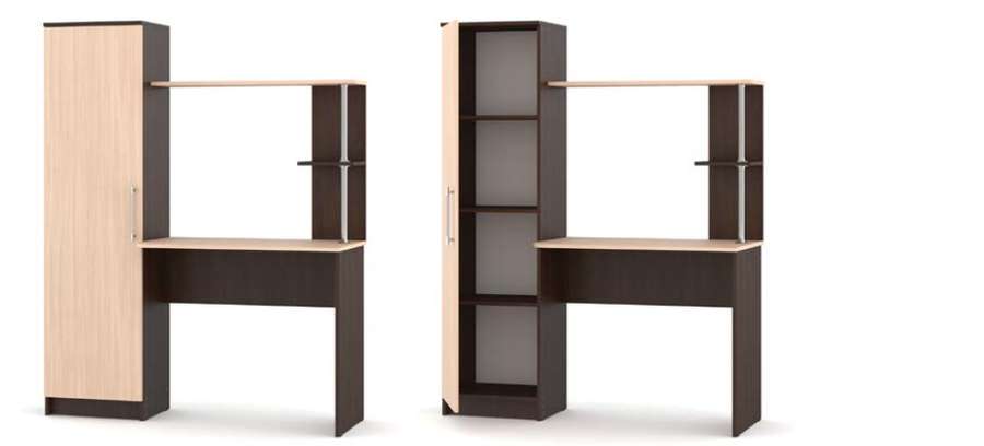 Кромка ПВХ толщиной 0,45мм в цвет материала. Ручка пластиковая С-15/192. Стол в правом исполнении. В левой части, за дверью, 4-е полки. Полка поддерживается металлической трубой диам.25мм, покрытие хром глянец.