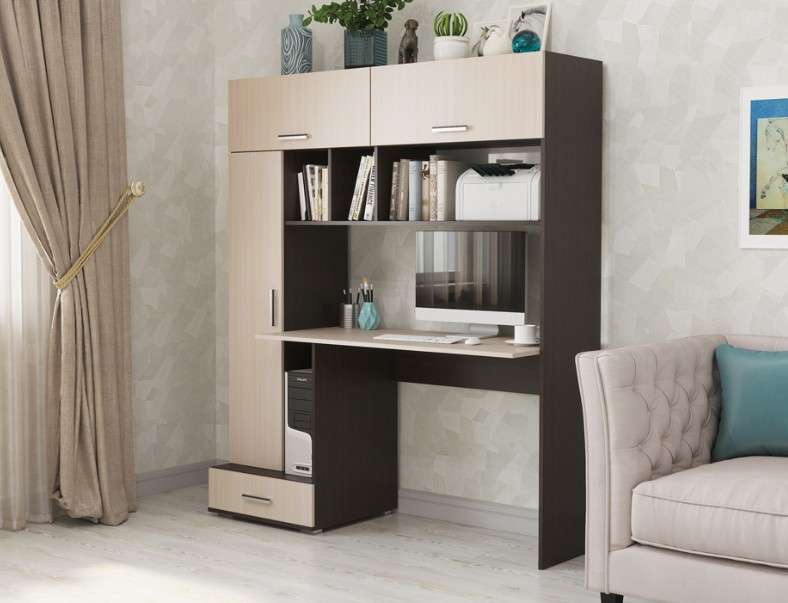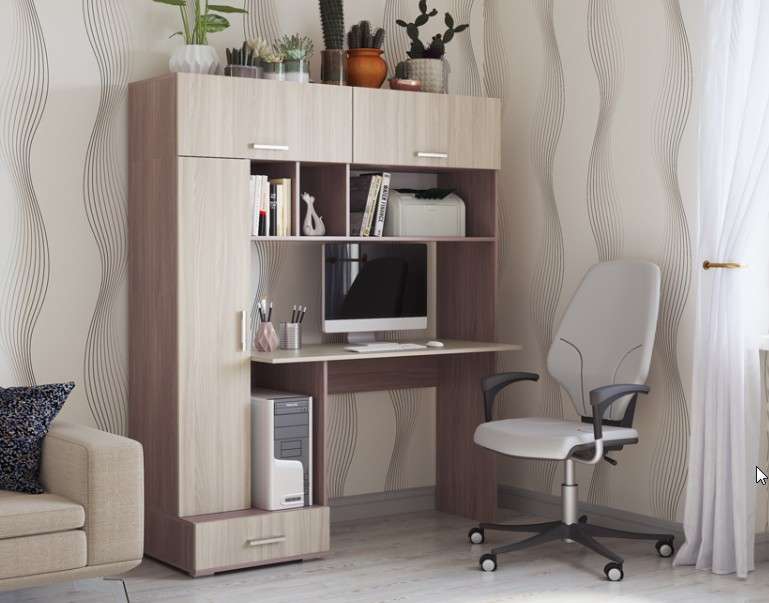 Очень симпатичный функциональный стол. Рабочая зона стола (под монитор и клавиатуру), ШхГ: 1200х570 мм, высота под монитор 430 мм.