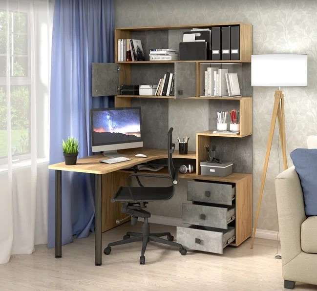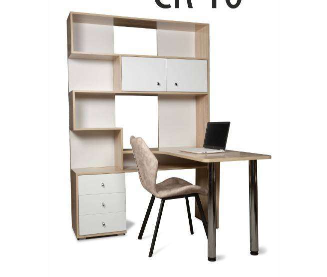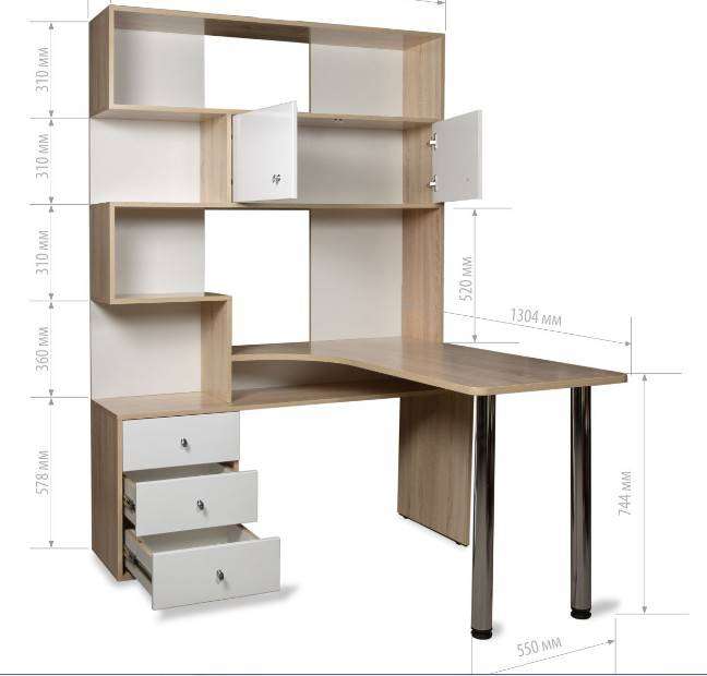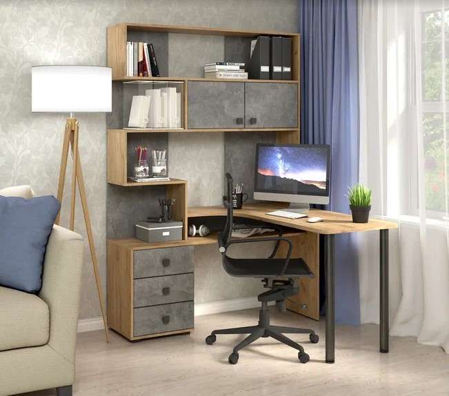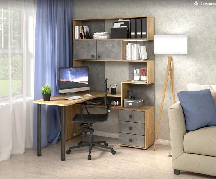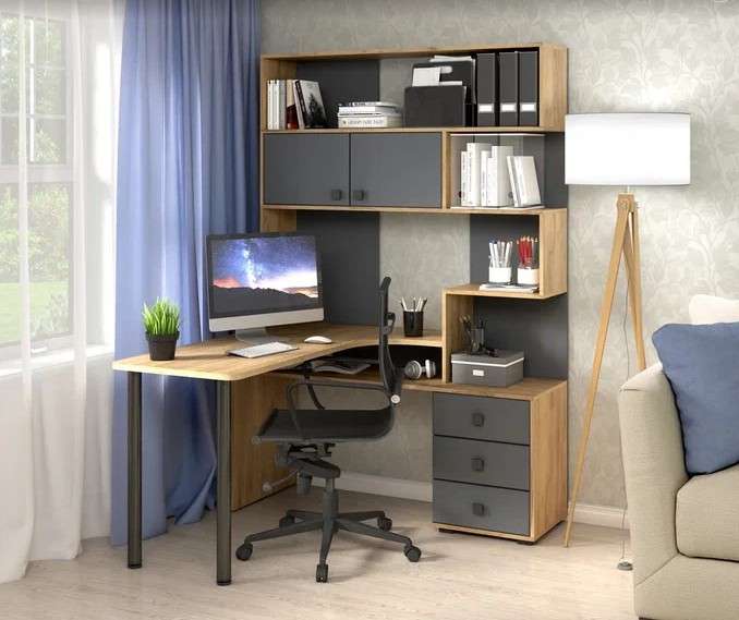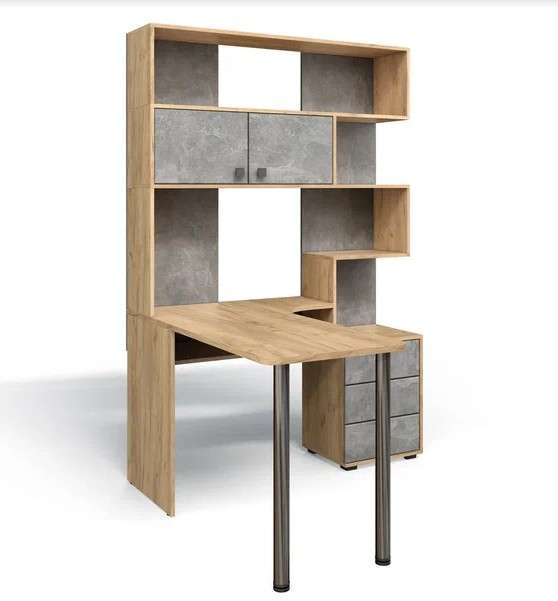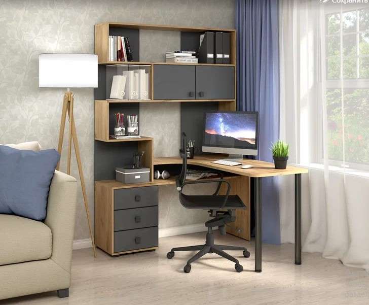 Функциональный компьютерный стол с большим количеством полочек и ящиками для хранения всех необходимых вещей. Имеет два варианта исполнения: правый и левый (определяется по расположению столешницы).