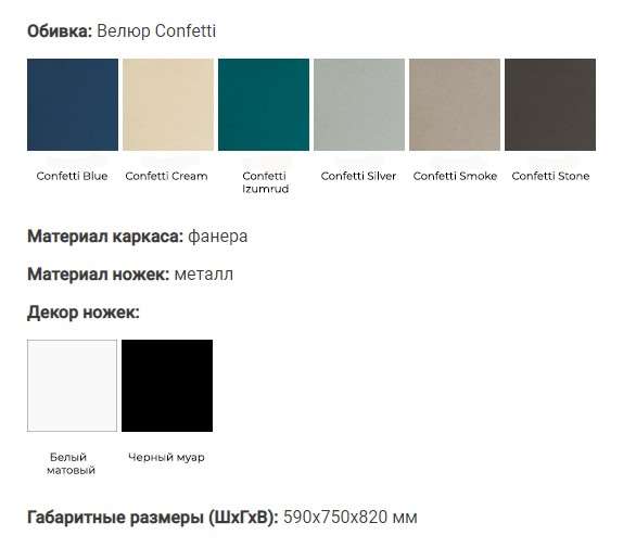 - Цвет: Велюр Confetti Blue, Велюр Confetti Cream, Велюр Confetti Izumrud, Велюр Confetti Silver, Велюр Confetti Smoke, Велюр Confetti Stone.