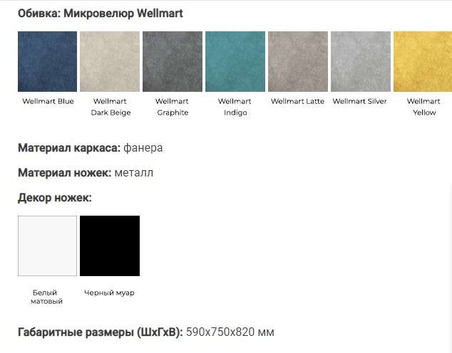 - Цвет: Микровелюр Wellmart Blue, Микровелюр Wellmart Dark Beige, Микровелюр Wellmart Graphite, Микровелюр Wellmart Indigo, Микровелюр Wellmart Latte, Микровелюр Wellmart Silver, Микровелюр Wellmart Yellow.