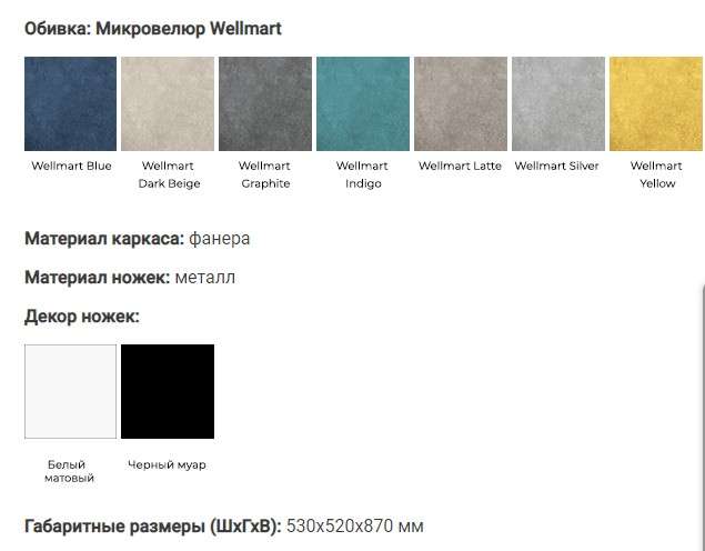 - Цвет: Микровелюр Wellmart Blue, Микровелюр Wellmart Dark Beige, Микровелюр Wellmart Graphite, Микровелюр Wellmart Indigo, Микровелюр Wellmart Latte, Микровелюр Wellmart Silver, Микровелюр Wellmart Yellow.