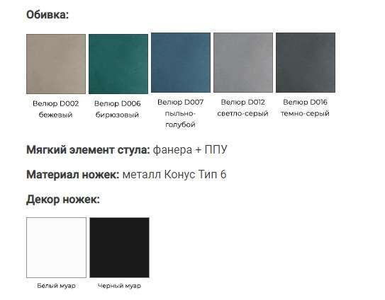 Металлические ножки с порошковым покрытием. Они расставлены под углом, что гарантирует максимальную устойчивость конструкции. Каркас окрашен в матовые глубокие цвета «Белый муар» и «Черный муар», которые сейчас очень популярны. На ножках предусмотрены пластиковые заглушки, которые придают стулу дополнительную устойчивость и защищают пол от царапин.
